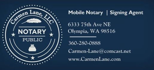 *REGARDING MOBILE NOTARY TRAVEL FEES: In Washington state, notary travel fees may be charged in addition to notarization fees. And although they are not required by law, I do charge a travel fee in my mobile notary business and I want you to be aware of this. My minimum basic notary travel fee is currently $50 USD plus $1 per mile round trip from my door to your door. Basic notarization fees in Washington are $15 per notarization for in-person notarizations. WAC 308.30.220: "A notary may charge a travel fee when traveling to perform a notarial act if: '(a) The notary and individual requesting the notarial act agree upon the travel fee in advance of the travel; and '(b) The notary explains to the individual requesting the notarial act that the travel fee is in addition to the notarial fee in subsection (1) of {WAC 308.30.220] and is not required by law' (WAC 308.30.0220[5])." If you do not agree to the rate you have been quoted for my services, you are not obligated to book with me. Take your documents to local UPS Store, attorney, or another notary public.
